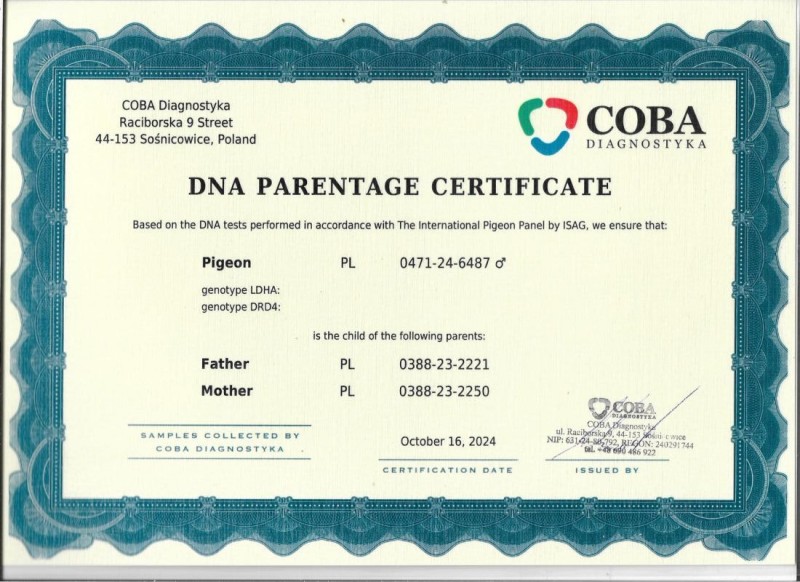PL-0471-24-6487 - oryg. S. Potępa (100% P. Mędrysa) podwójny wnuk olimp. 79, podwójny wnuk olimp.5990 CERTYFIKAT DNA