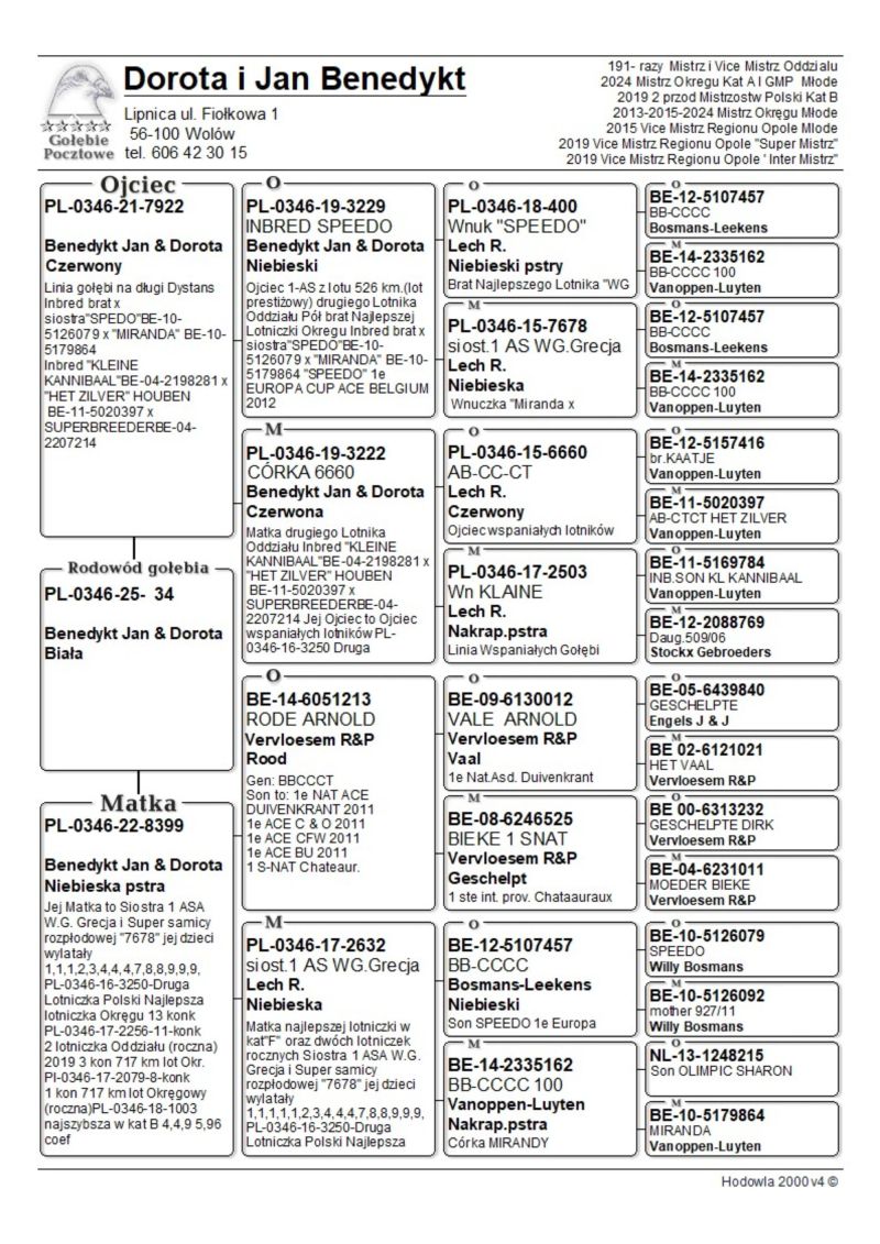 PL-0346-25-556 oryg. oryg. Benedykt J. i D. 2024r. Mistrz Okręgu kat A i GMP Młode 3 i 4-Zespół Lotników Polski HGP 2-przod. Mistrzostw Polski Kat.B 191 x Mistrz i Vice Mistrz Oddziału Linia: inbred „Inbred Harry” J.Hooymans x „Speedo x kannibaal”