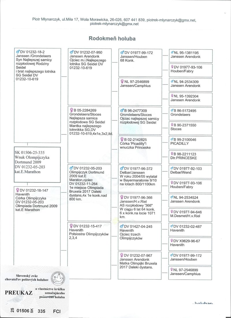 SK-01506-25-370 Havenith gołąb dalekodystansowy, wnuk Olimpijki Bruksela 2017 kat.Daleki dystans DV 01232-11-264