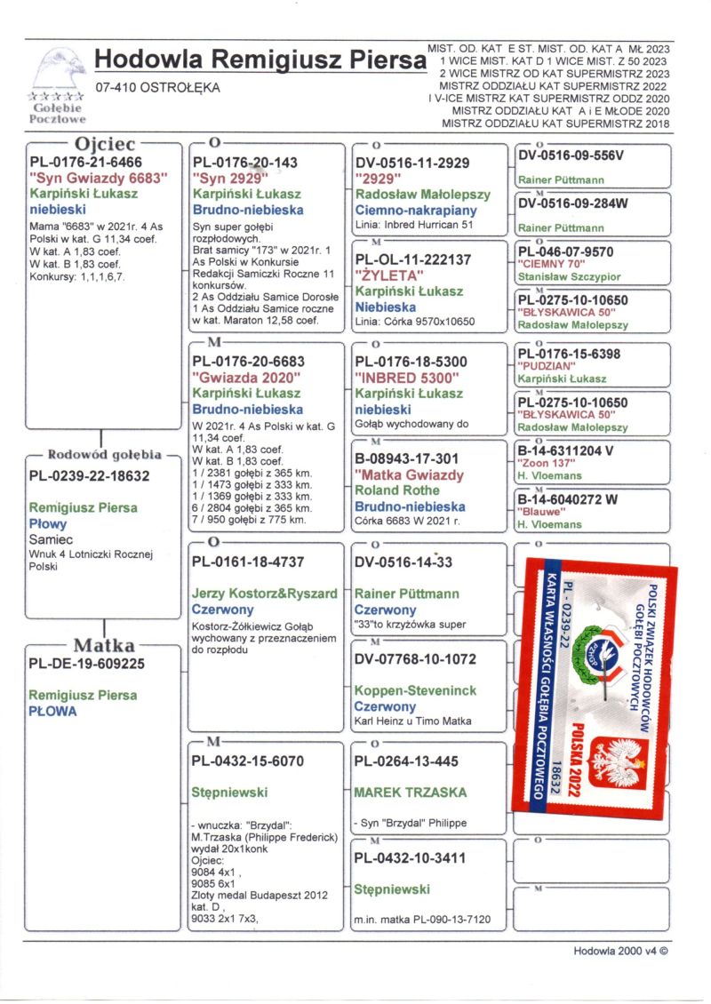 Oryginalny gołąb z hodowli Remigiusza Piersy . Szczegóły pochodzenia w rodowodzie. Dostawa gołębi będzie realizowana po zakończeniu aukcji kurierem lub odbiór osobisty. Więcej informacji pod nr tel.: 693334762