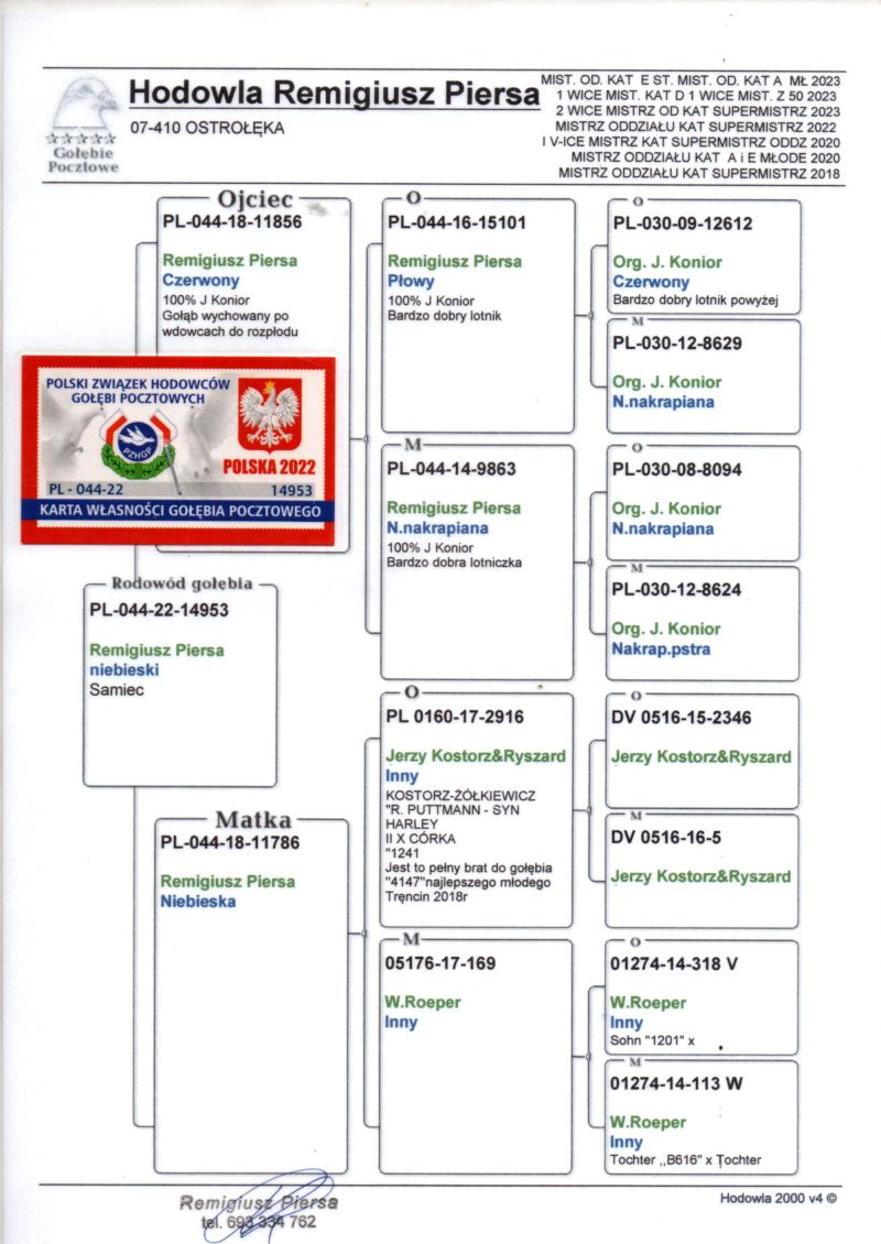Oryginalny gołąb z hodowli Remigiusza Piersy . Szczegóły pochodzenia w rodowodzie. Dostawa gołębi będzie realizowana po zakończeniu aukcji kurierem lub odbiór osobisty. Więcej informacji pod nr tel.: 693334762