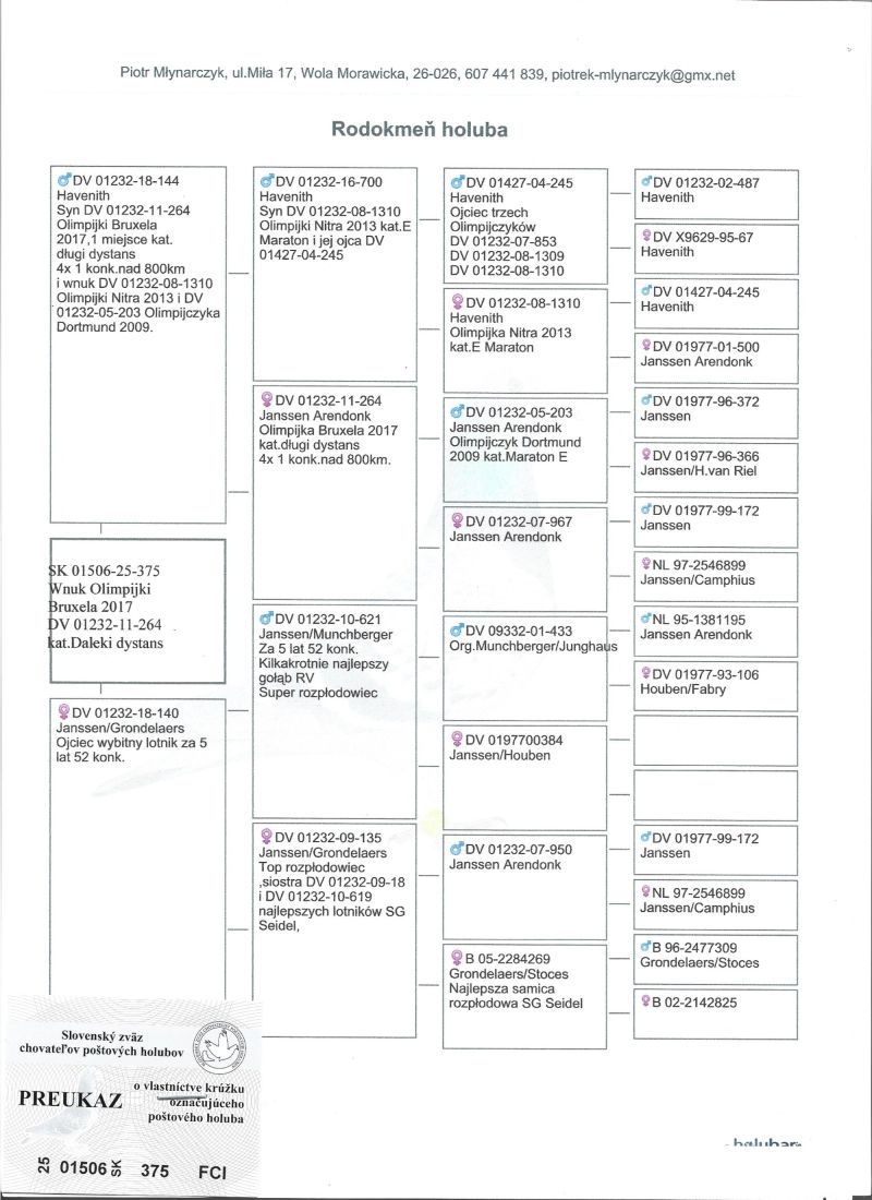 Havenith , gołąb dalekodystansowy. Wnuk (wnuczka)Olimpijki Bruksela 2017 kat.E daleki dystans DV 01232-11-264, m.in. Zdobyła 4x 1 konk. na odległości nad 800 km. Rodzina Seidel posiada siedmiu Olimpijczyków w kategorii daleki dystans, m.in. DV 01232-15-306 Olimpijka z Oradea 2022, pierwszy gołąb niemiec i 17 świata. Gołąbki zaszczepione msv i odrobaczone. Transport gołębi kurierem koszt 150 zł. Albo odbiór osobisty.