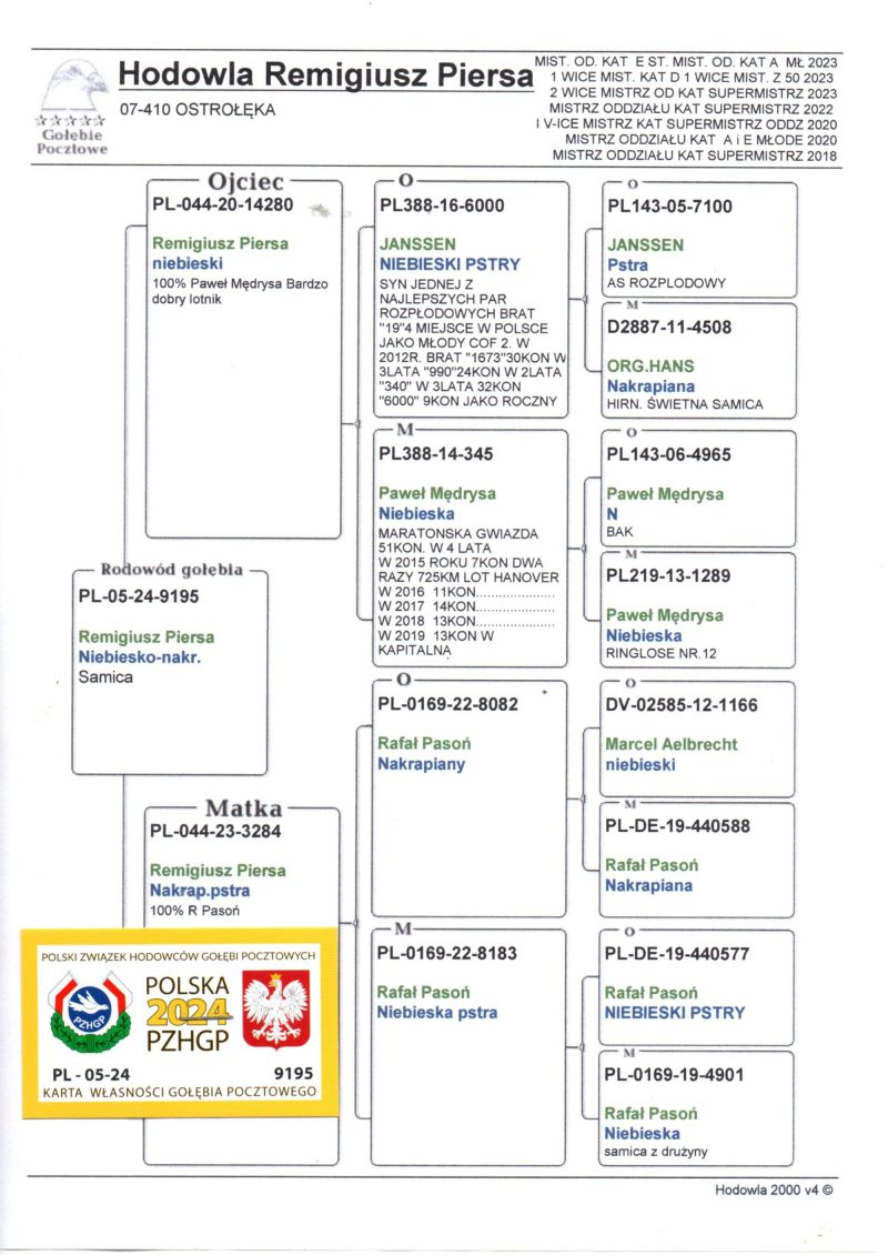 Oryginalny gołąb z hodowli Remigiusza Piersy . Szczegóły pochodzenia w rodowodzie. Dostawa gołębi będzie realizowana po zakończeniu aukcji kurierem lub odbiór osobisty. Więcej informacji pod nr tel.: 693334762