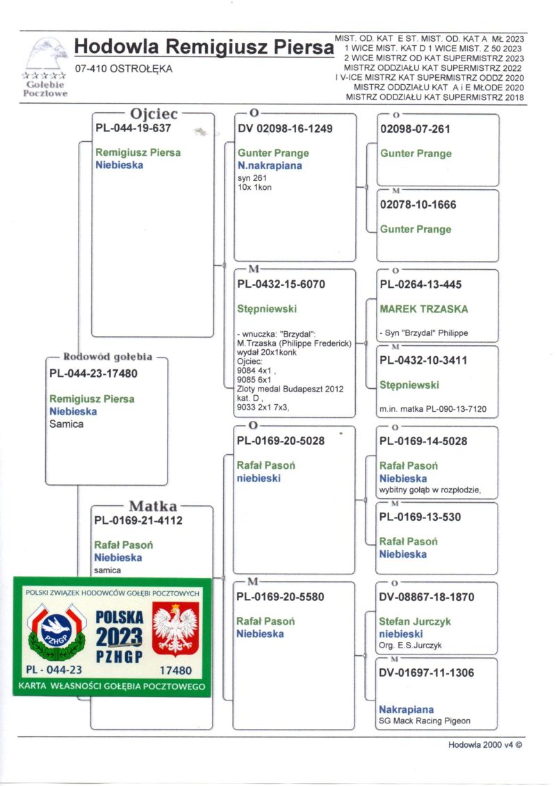 Oryginalny gołąb z hodowli Remigiusza Piersy . Szczegóły pochodzenia w rodowodzie. Dostawa gołębi będzie realizowana po zakończeniu aukcji kurierem lub odbiór osobisty. Więcej informacji pod nr tel.: 693334762