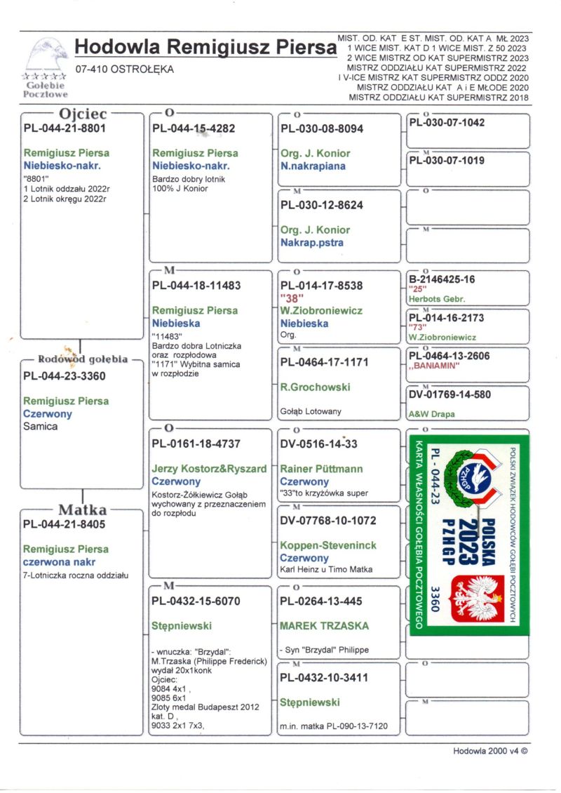 Oryginalny gołąb z hodowli Remigiusza Piersy . Szczegóły pochodzenia w rodowodzie. Dostawa gołębi będzie realizowana po zakończeniu aukcji kurierem lub odbiór osobisty. Więcej informacji pod nr tel.: 693334762
