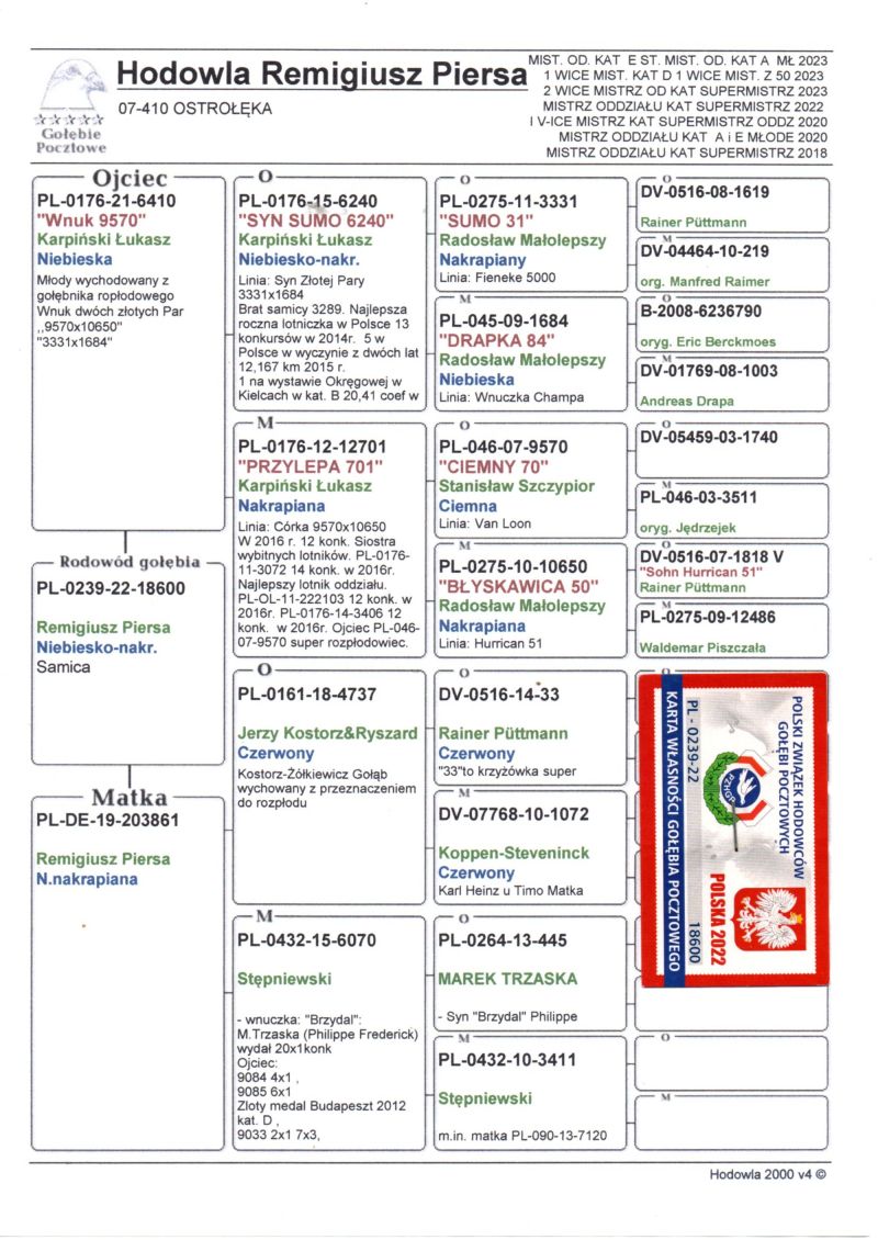 Oryginalny gołąb z hodowli Remigiusza Piersy . Szczegóły pochodzenia w rodowodzie. Dostawa gołębi będzie realizowana po zakończeniu aukcji kurierem lub odbiór osobisty. Więcej informacji pod nr tel.: 693334762