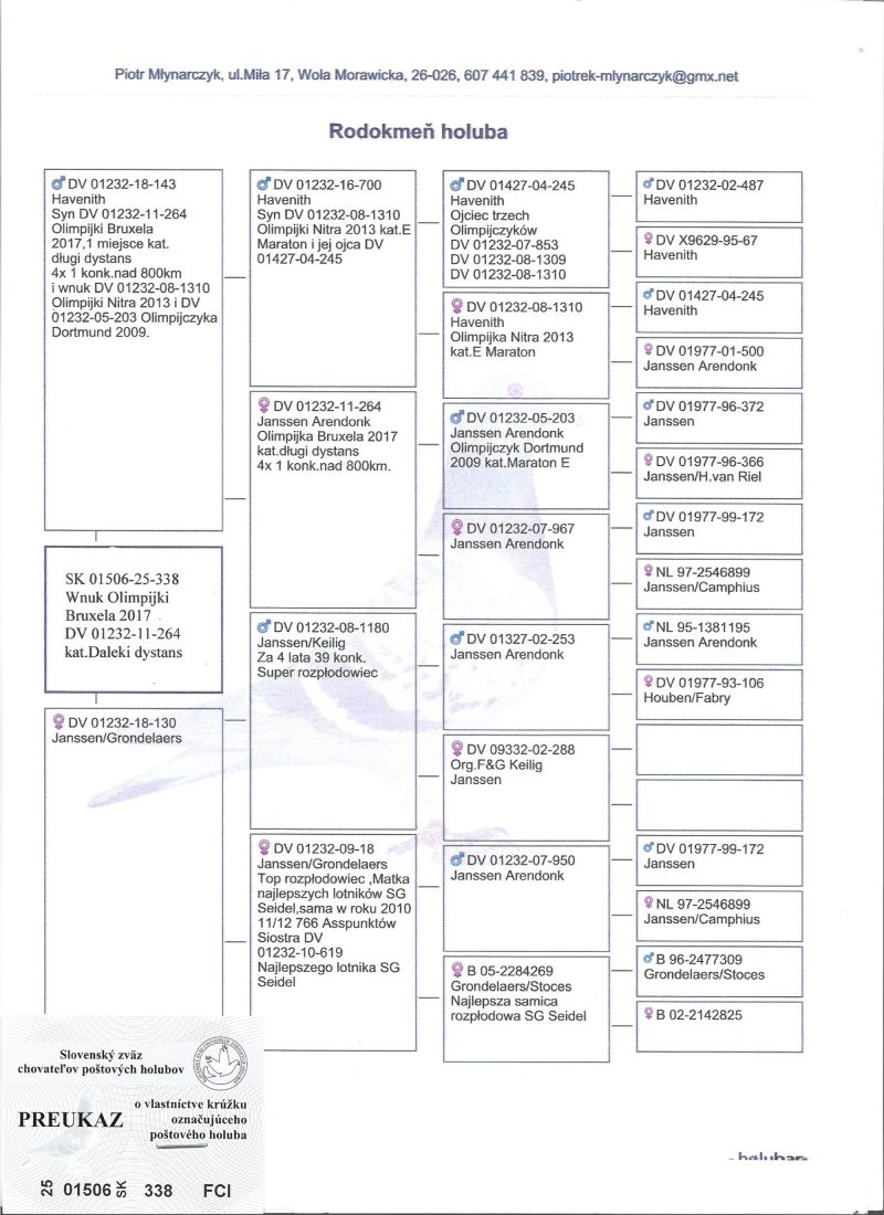 SK-01506-25-370 Havenith gołąb dalekodystansowy, wnuk Olimpijki Bruksela 2017 kat.Daleki dystans DV 01232-11-264