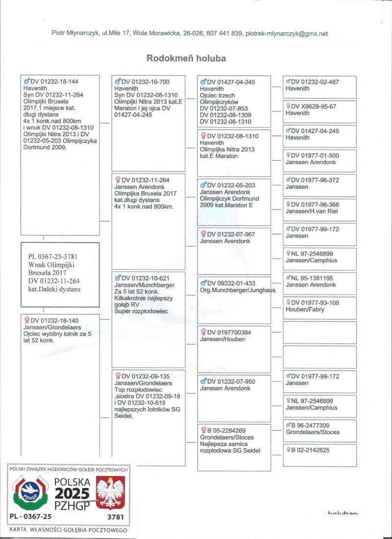 Havenith , gołąb dalekodystansowy. Wnuk (wnuczka) Olimpijki Bruksela 2017 kat.E daleki dystans DV 01232-11-264, m.in. zdobyła 4x 1 konk. na odległości nad 800 km. Rodzina Seidel posiada siedmiu Olimpijczyków w kategorii daleki dystans, m.in. DV 01232-15-306 Olimpijka z Oradea 2022, pierwszy gołąb niemiec i 17 świata. Gołąbki zaszczepione msv i odrobaczone. Transport gołębi kurierem koszt 150 zł. Albo odbiór osobisty.
