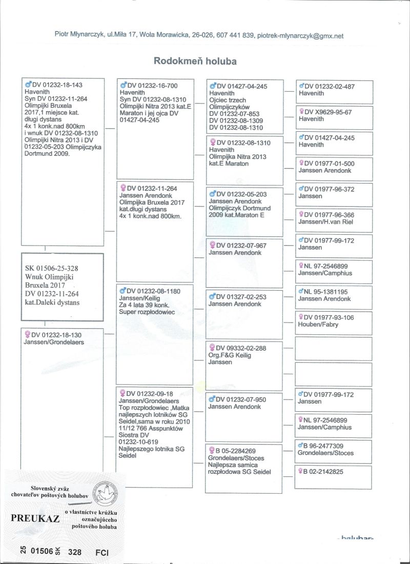 SK-01506-25-316 Havenith gołąb dalekodystansowy, wnuk Olimpijki Bruksela 2017 kat.Daleki dystans DV 01232-11-264