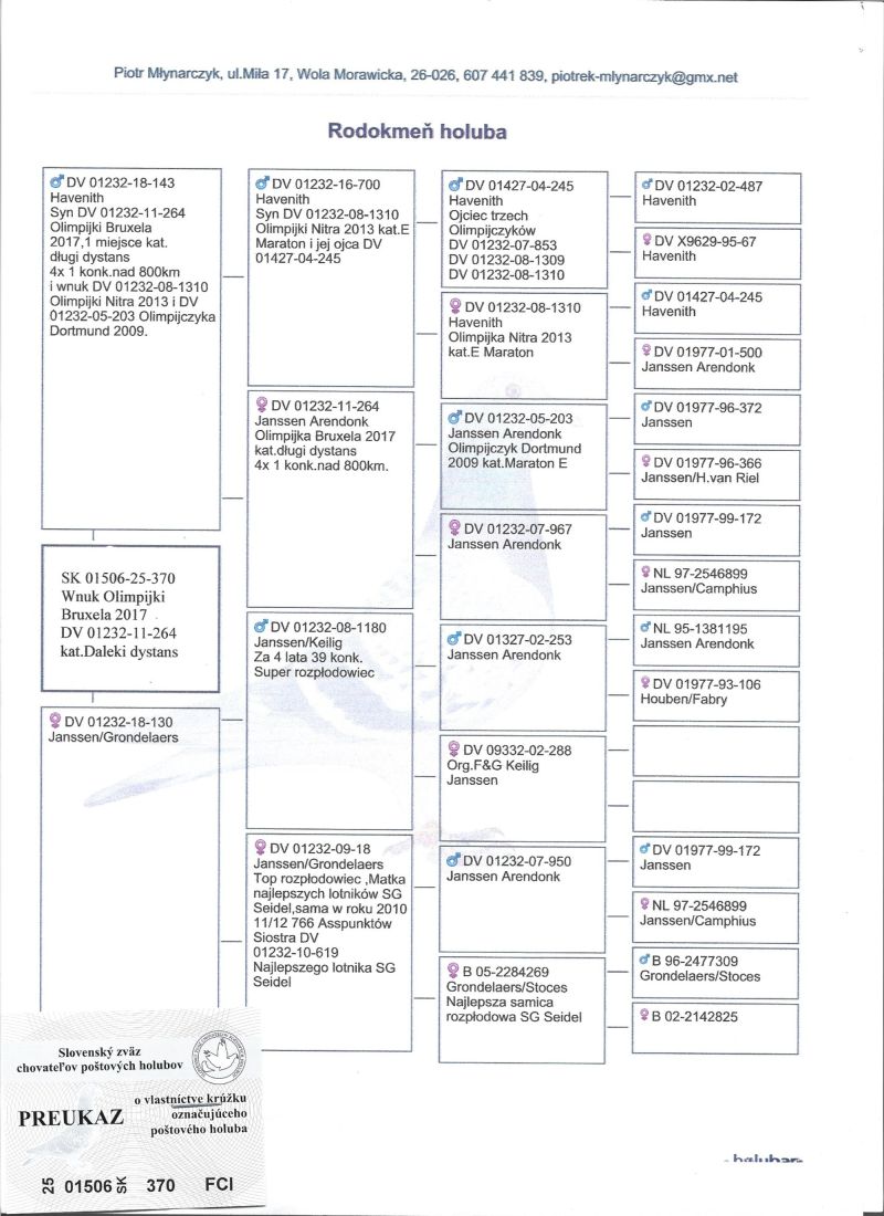 SK-01506-25-352 Havenith gołąb dalekodystansowy, wnuk Olimpijczyka Nitra 2013 kat.Daleki dystans DV 01232-08-1309