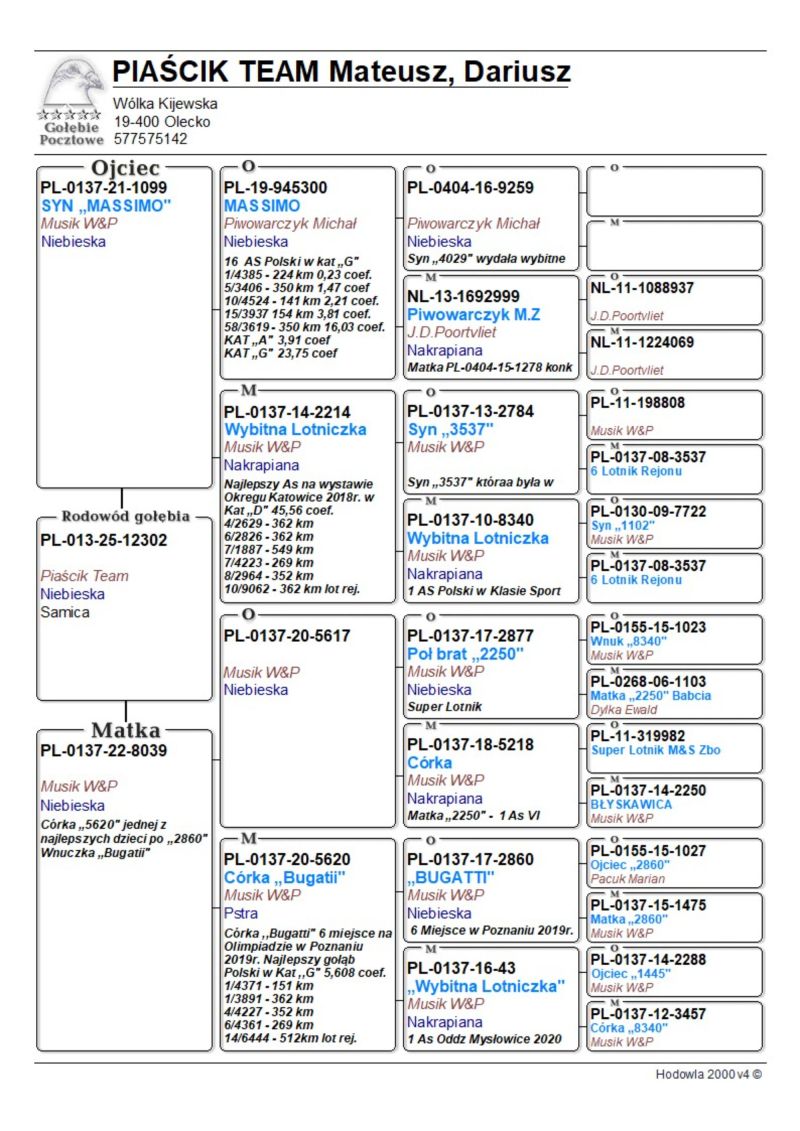 WNUK/WNUCZKA PODSTAWOWEGO SAMCA ROZPŁODOWEGO HODOWLI "MASSIMO 300" ORYG. MICHAŁ PIWOWARCZYK - 16AS POLSKI W KAT. G 2020R / SAMCZYK TEN JEST OJCEM I DZIADKIEM WIELU CZOŁOWYCH LOTNIKÓW! |WNUK/WNUCZKA WYBITNEJ LOTNICZKI "14-2214" - 1AS OKRĘGU KATOWICE W KAT. D 2018R! M.IN.: 4, 6, 7, 7, 8, 10, 15, 15, 18.. |Wiecej informacji o gołębiu pod nr tel.:577575142 Szczegóły pochodzenia gołębia w rodowodzie