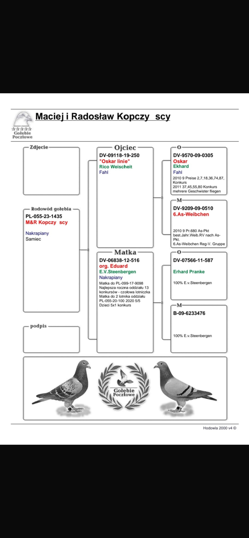Kontakt: 577575142Opis: Oryginalny gołab z hodowli M. i R. Kopczyńscy |Wiecej informacji o gołębiu pod nr tel.:577575142 Szczegóły pochodzenia gołębia w rodowodzie|