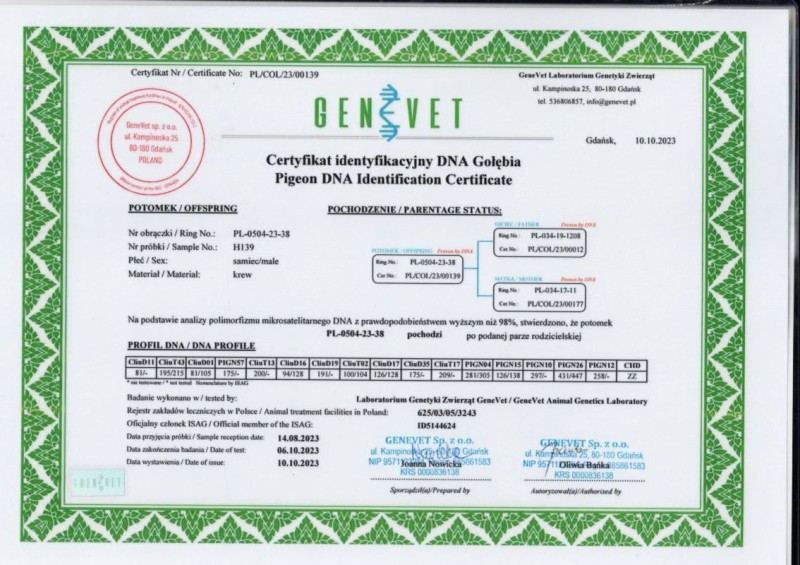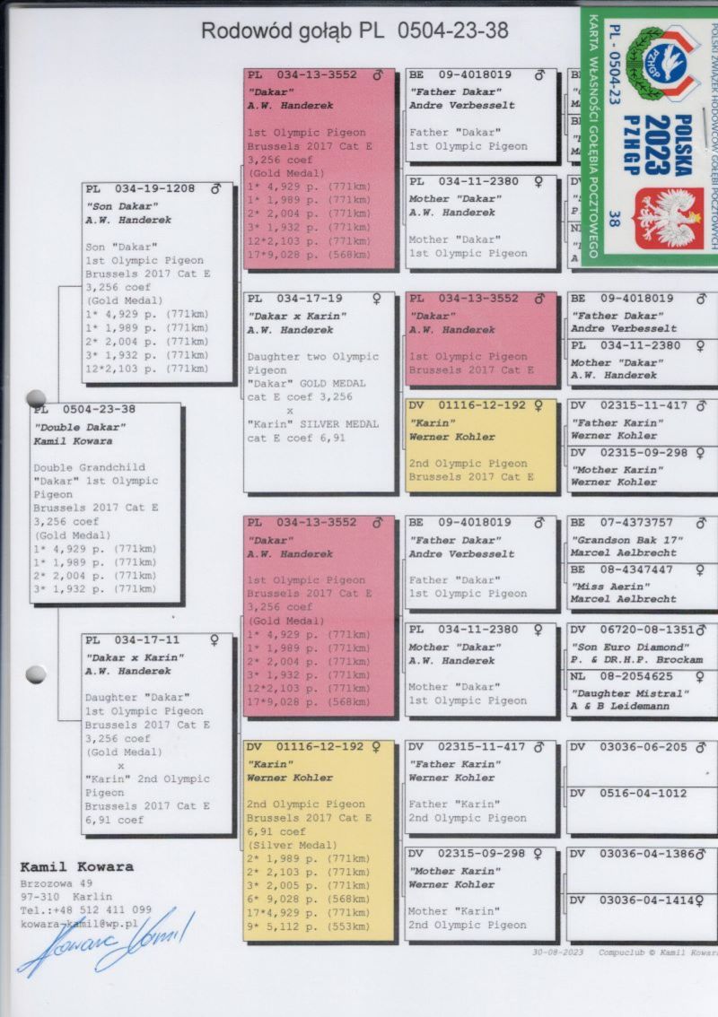 PL-0504-23-38 Inbred DAKAR - certyfikat DNA Wnuk Dakar - Wnuk Karin