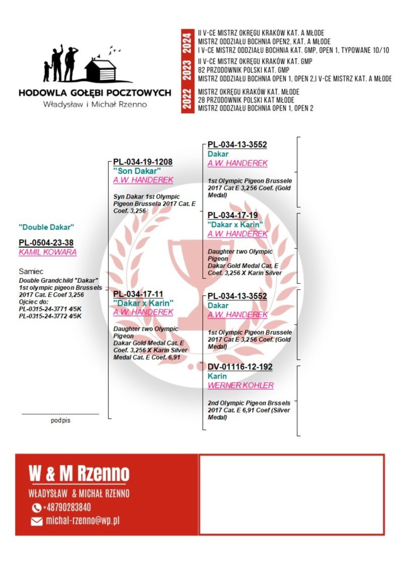 Gołąb pochodzi z hodowli Władysław & Michał Rzenno. Gołębie lotowane w lotach gołębi młodych. Wyniki hodowli do sprawdzenia na stronie oddziałowej: