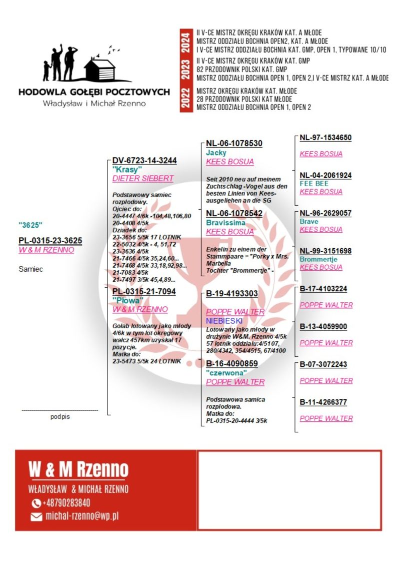 Gołąb pochodzi z hodowli Władysław & Michał Rzenno. Gołębie lotowane w lotach gołębi młodych. Wyniki hodowli do sprawdzenia na stronie oddziałowej: