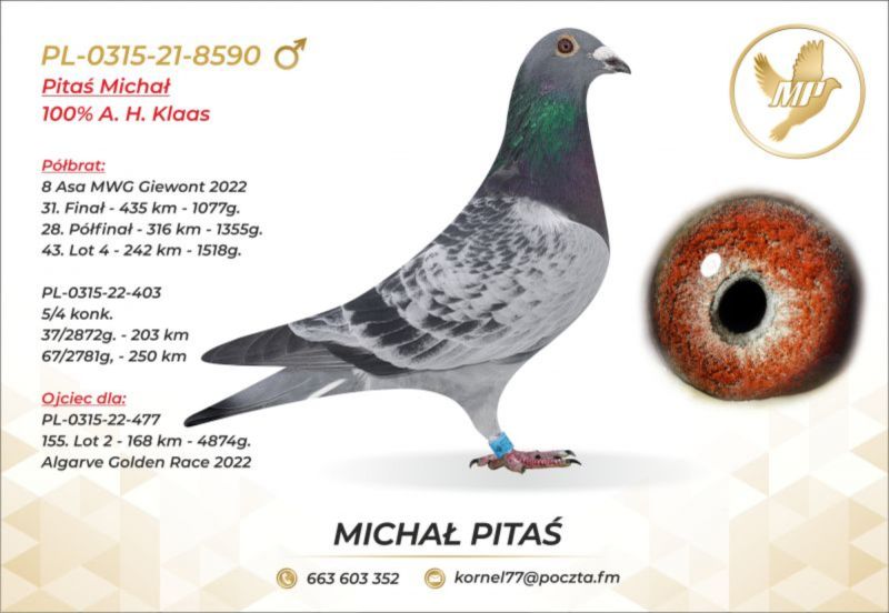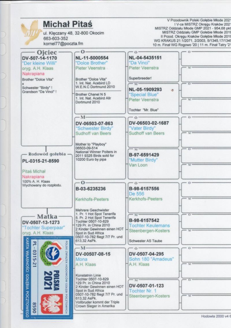Gołąb pochodzi z hodowli Władysław & Michał Rzenno. Gołębie lotowane w lotach gołębi młodych. Wyniki hodowli do sprawdzenia na stronie oddziałowej: