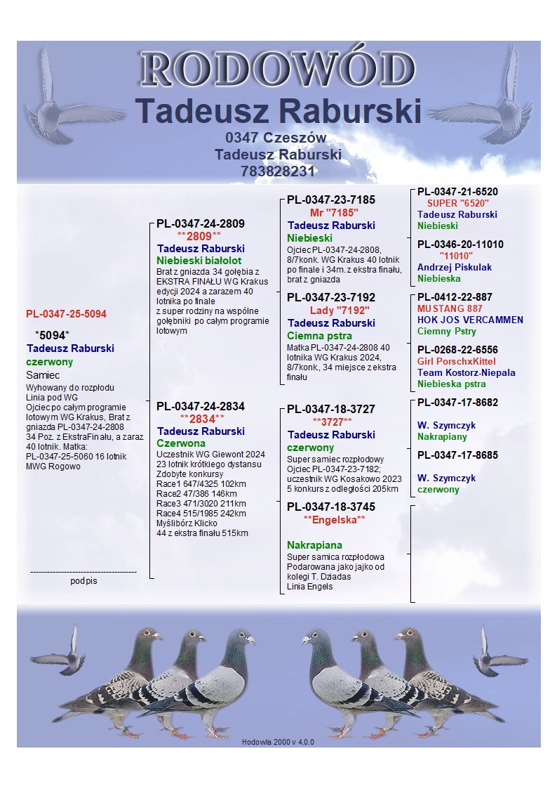 Hodowla skupiona w lotach gołębi na wspólnych gołębnikach z wieloma sukcesami. Zaprasza Państwa do licytacji wartościowego materiału do dalszej hodowli. Proponowany gołąb to linia moich dwóch bazowych par rozpłodowych, wielu kuzynów osiąga sukcesy na wspólnych gołębnikach. Więcej informacji w rodowodzie oraz pod nr. tel. WYSYŁKA 100ZŁ