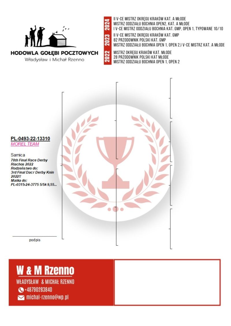 Gołąb pochodzi z hodowli Władysław & Michał Rzenno. Gołębie lotowane w lotach gołębi młodych. Wyniki hodowli do sprawdzenia na stronie oddziałowej: