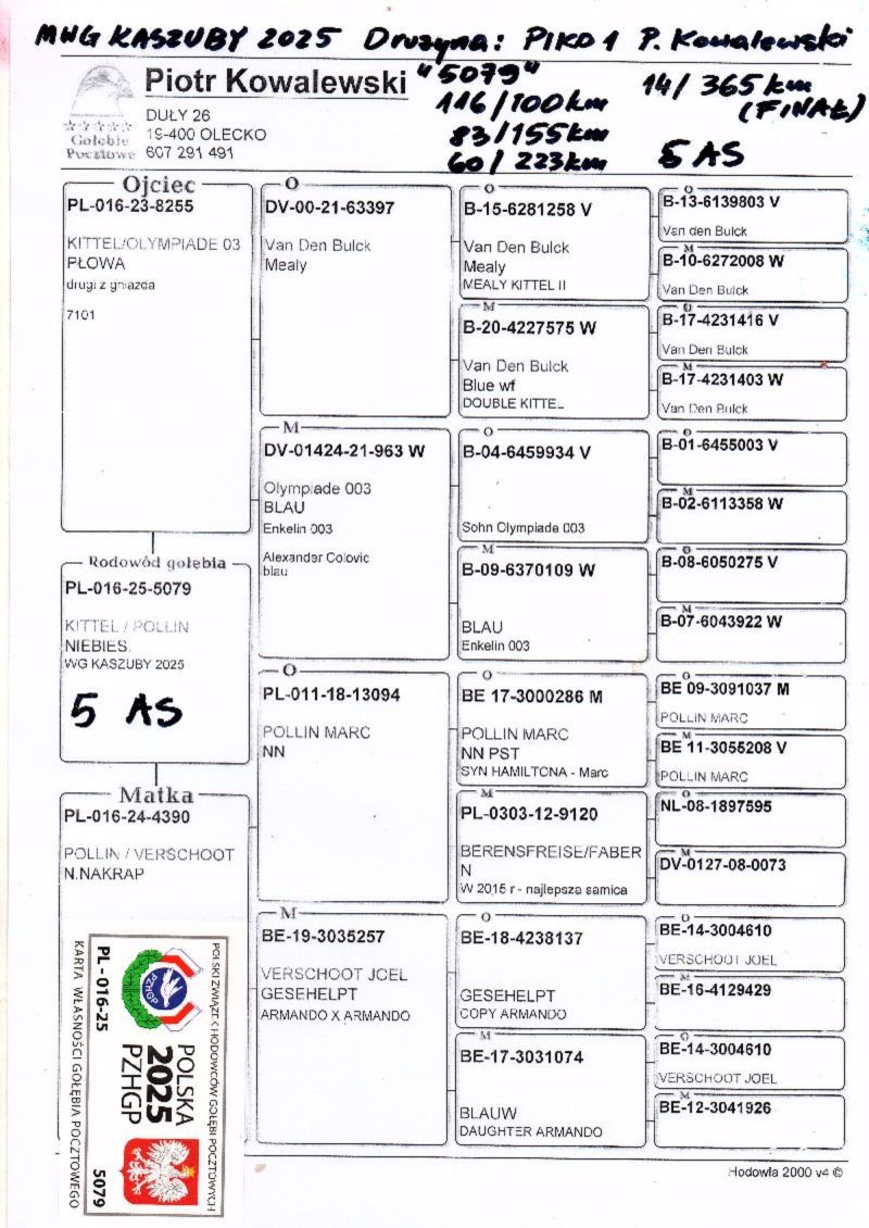 Gołąb (5 AS, 14 MIEJSCE z lotu Finałowego) brał udział w zawodach na Wspólnym Gołębniku KASZUBY. Więcej informacji w rodowodzie i załącznikach. Kontakt do Właściciela Gołębnika tel.601686344 (Sebastian Ostoja-Lniski). Informujemy poza tym, że rozpoczęły się zapisy na sezon 2026. Serdecznie zapraszam do rywalizacji.