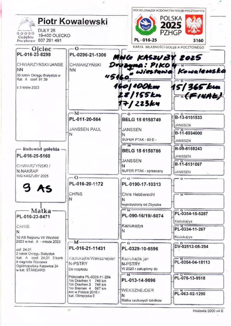 Gołąb (9 AS, 15 MIEJSCE z lotu Finałowego) brał udział w zawodach na Wspólnym Gołębniku KASZUBY. Więcej informacji w rodowodzie i załącznikach. Kontakt do Właściciela Gołębnika tel.601686344 (Sebastian Ostoja-Lniski). Informujemy poza tym, że rozpoczęły się zapisy na sezon 2026. Serdecznie zapraszam do rywalizacji.