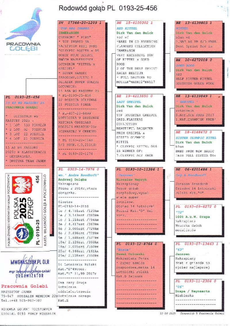 Gołąb (21 MIEJSCE z lotu Finałowego) brał udział w zawodach na Wspólnym Gołębniku KASZUBY. Więcej informacji w rodowodzie i załącznikach. Kontakt do Właściciela Gołębnika tel.601686344 (Sebastian Ostoja-Lniski). Informujemy poza tym, że rozpoczęły się zapisy na sezon 2026. Serdecznie zapraszam do rywalizacji.