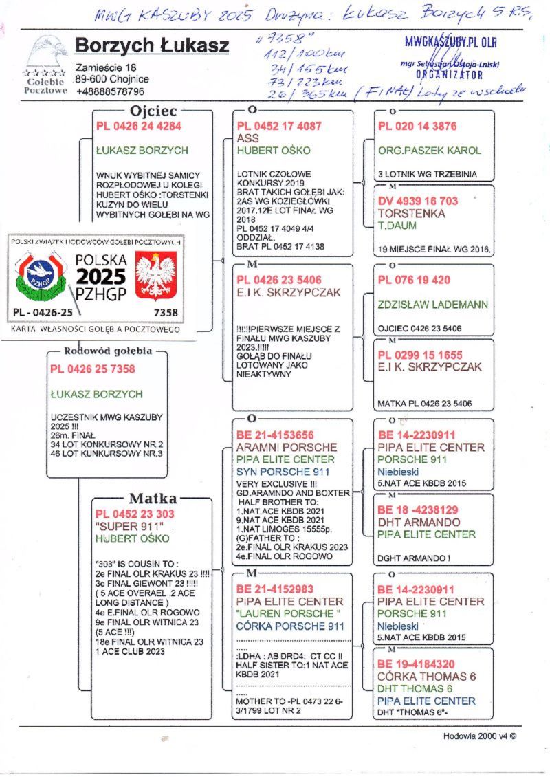 Gołąb (26 MIEJSCE z lotu Finałowego) brał udział w zawodach na Wspólnym Gołębniku KASZUBY. Więcej informacji w rodowodzie i załącznikach. Kontakt do Właściciela Gołębnika tel.601686344 (Sebastian Ostoja-Lniski). Informujemy poza tym, że rozpoczęły się zapisy na sezon 2026. Serdecznie zapraszam do rywalizacji.