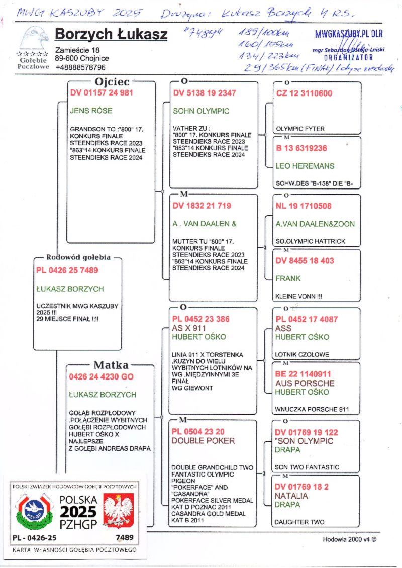 Gołąb (29 MIEJSCE z lotu Finałowego) brał udział w zawodach na Wspólnym Gołębniku KASZUBY. Więcej informacji w rodowodzie i załącznikach. Kontakt do Właściciela Gołębnika tel.601686344 (Sebastian Ostoja-Lniski). Informujemy poza tym, że rozpoczęły się zapisy na sezon 2026. Serdecznie zapraszam do rywalizacji.