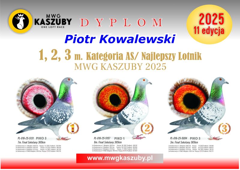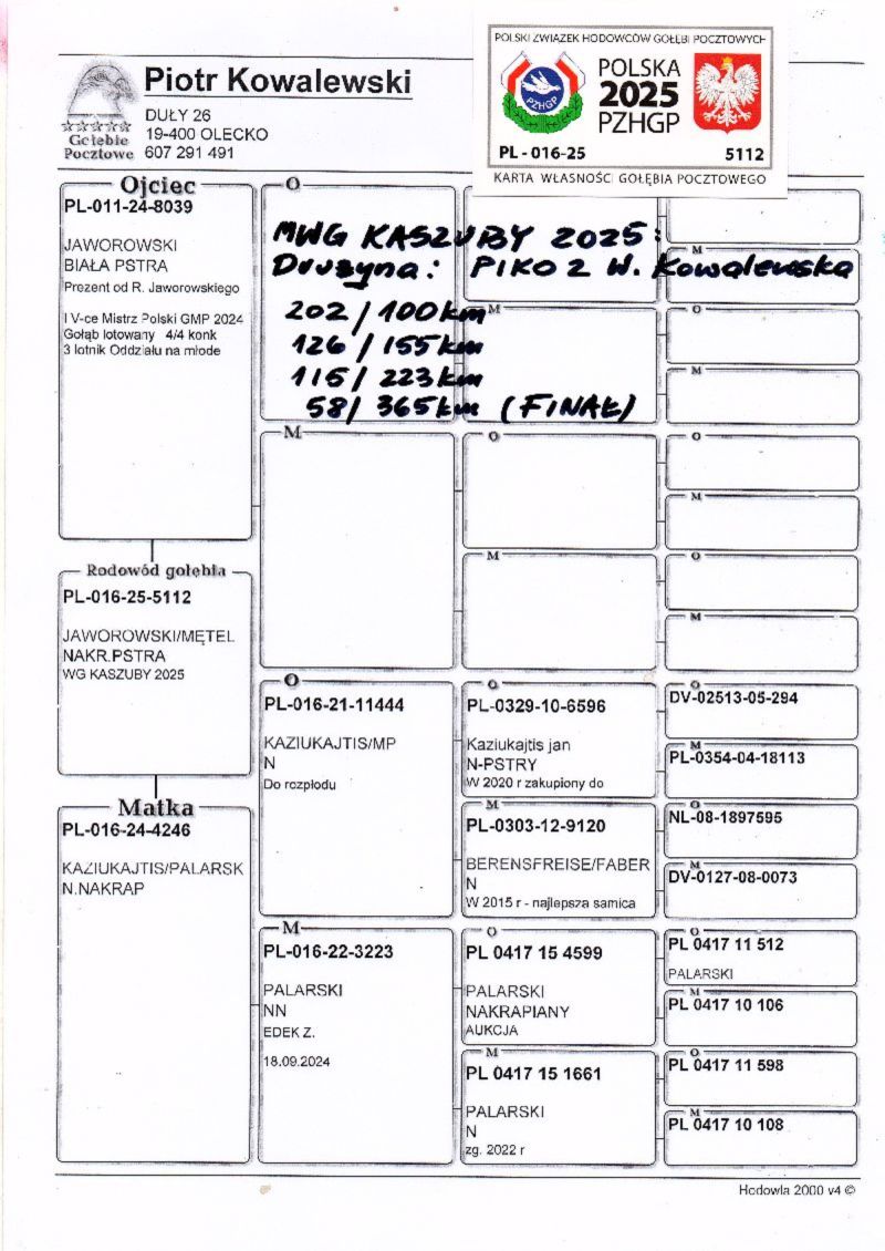 Gołąb (58 MIEJSCE z lotu Finałowego) brał udział w zawodach na Wspólnym Gołębniku KASZUBY. Więcej informacji w rodowodzie i załącznikach. Kontakt do Właściciela Gołębnika tel.601686344 (Sebastian Ostoja-Lniski). Informujemy poza tym, że rozpoczęły się zapisy na sezon 2026. Serdecznie zapraszam do rywalizacji.