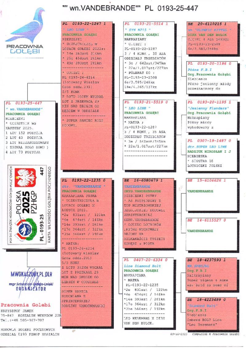 Gołąb (73 MIEJSCE z lotu Finałowego) brał udział w zawodach na Wspólnym Gołębniku KASZUBY. Więcej informacji w rodowodzie i załącznikach. Kontakt do Właściciela Gołębnika tel.601686344 (Sebastian Ostoja-Lniski). Informujemy poza tym, że rozpoczęły się zapisy na sezon 2026. Serdecznie zapraszam do rywalizacji.