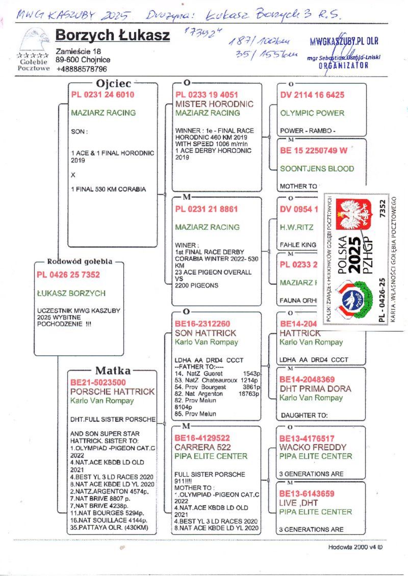 Gołąb brał udział w zawodach na Wspólnym Gołębniku KASZUBY. Więcej informacji w rodowodzie i załącznikach. Kontakt do Właściciela Gołębnika tel.601686344 (Sebastian Ostoja-Lniski). Informujemy poza tym, że rozpoczęły się zapisy na sezon 2026. Serdecznie zapraszam do rywalizacji.