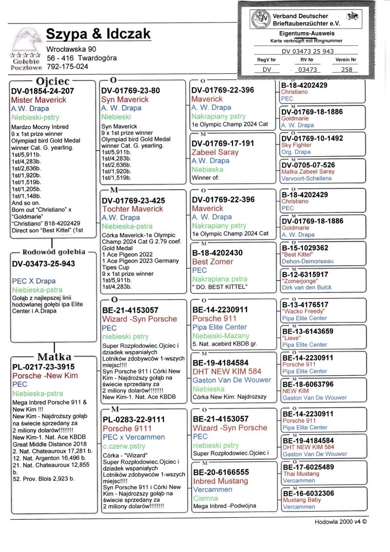 Profesjonalna hodowla z wieloletnim doświadczeniem, posiadająca w swoim stadzie materiał najwyższej światowej klasy. Więcej informacji w załączonych materiałach oraz pod nr tel. 792-175-024 Oferowany gołąb to prawdopodobnie SAMICA. Płeć pisana orientacyjnie Wysyłka 100 zł