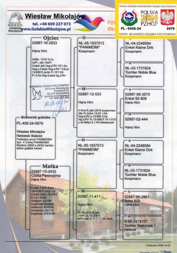 Oryginalny gołąb z hodowli Wiesława Mikołajów. Jest to inbred na słynnego gołębia Hansa Hirna Panimdima Szczegóły w rodowodzie. Więcej informacji pod nr tel.: 665-978-510