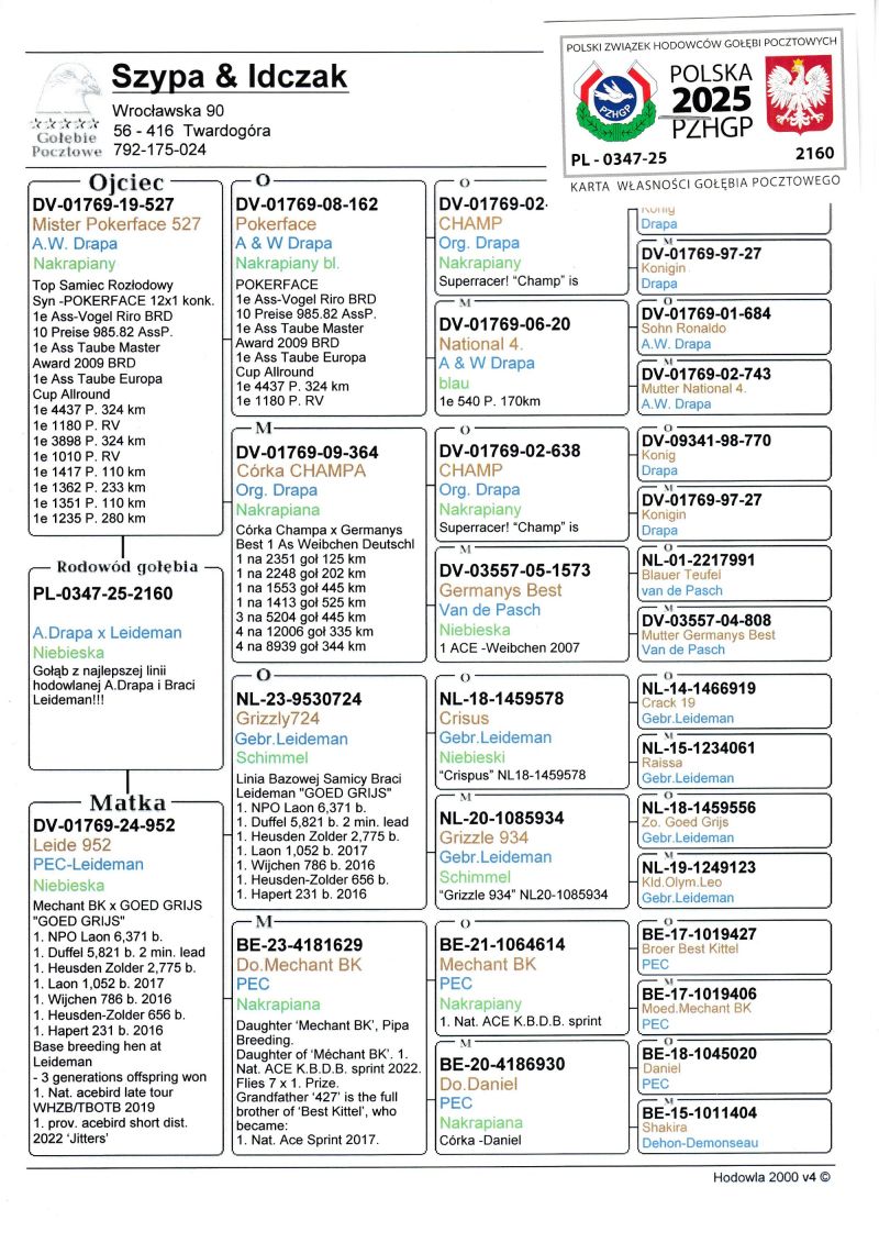 Profesjonalna hodowla z wieloletnim doświadczeniem, posiadająca w swoim stadzie materiał najwyższej światowej klasy. Więcej informacji w załączonych materiałach oraz pod nr tel. 792-175-024 Oferowany gołąb to prawdopodobnie SAMICA. Płeć pisana orientacyjnie Wysyłka 100 zł