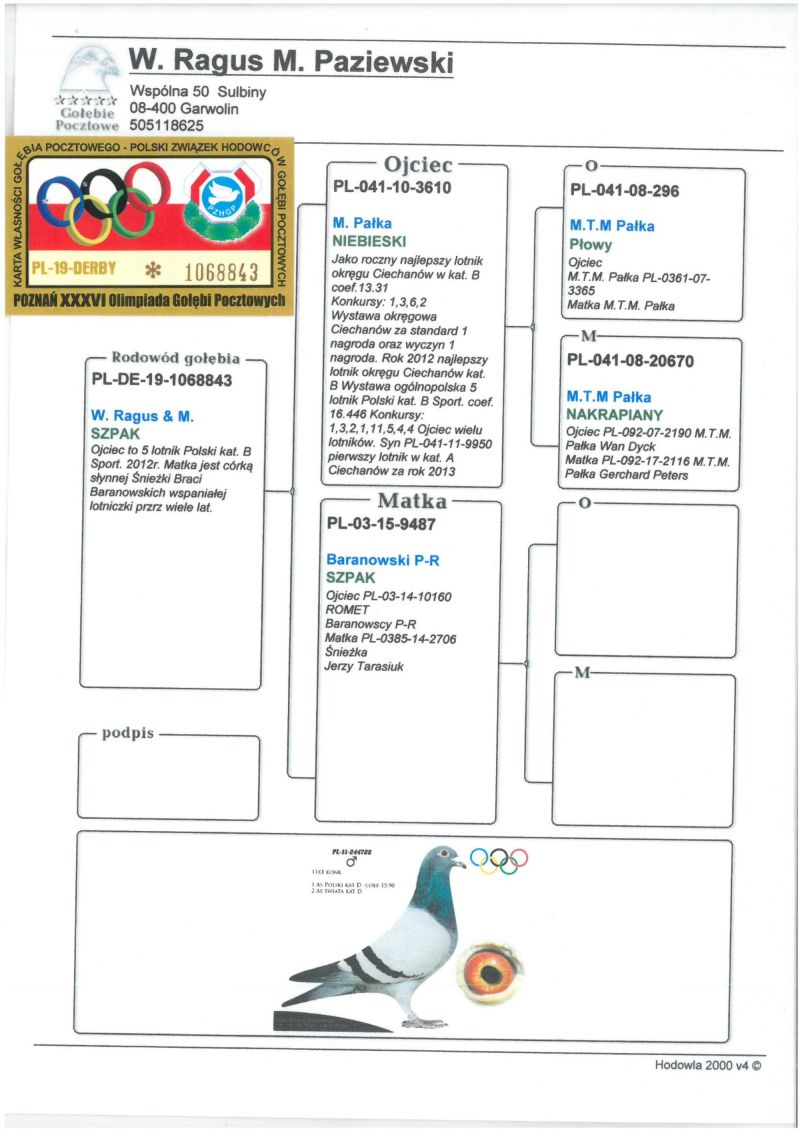 Oryginalny gołąb z hodowli W.Ragus. Więcej informacji w rodowodzie oraz pod telefonem: 788380579
