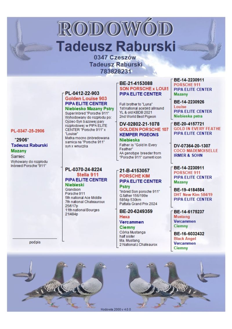 Hodowla skupiona w lotach gołębi na wspólnych gołębnikach z wieloma sukcesami. Zaprasza Państwa do licytacji wartościowego materiału do dalszej hodowli. Proponowany gołąb to inbreed Porsche 911 x Mustang Vercammen x New Kim Więcej informacji w rodowodzie oraz pod nr. tel. !Uwaga! WYSYŁKA 100ZŁ