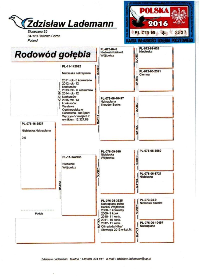 Oryginalny gołąb z hodowli Adama Bank z Oddziału 076 Wejherowo. Super Lotniczka, głównie na średnim dystansie, kat.B-15,73 conf, matka Org. Zdzisław Lademann ze złotej pary, ojciec to syn Viktorii 3 x w Reprezentacji Okręgu. Więcej informacji w rodowodzie i pod numerem 505-418-160. Koszt wysyłki 150zł.