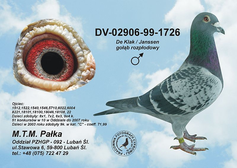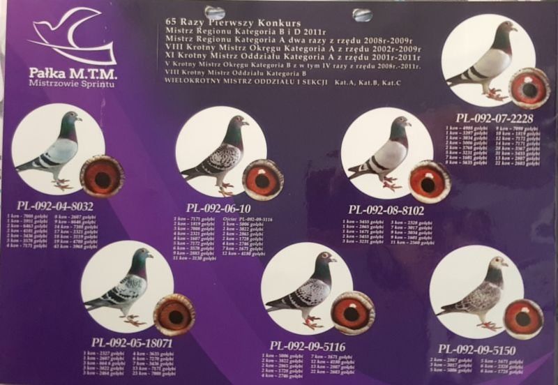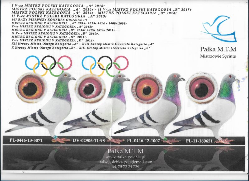 Oryginalna samiczka z Mistrzowskiej Hodowli M.T.M. Pałka Linia "1360" i "1726", KITTEL I olimpic KITTEL . Więcej informacji o gołębiu pod nr tel. i poniższych materiałach. Nasze wyniki w Mistrzostwie Polski 2018: 6 Miejsce w Intermistrzostwie Międzynarodowym - coeff. 151,73; 23 Miejsce GMP - 1874,73; 29 Miejsce Kat.B - coeff. 86,45. 1 Miejsce Gołąb Średni dystans-Konkurs Redakcji "Hodowca", 1 Miejsce Kat."B"-Konkurs Redakcji "Dobry Lot", 3 Miejsce Kat."D"-Konkurs Redakcji "Dobry Lot", 2 Miejsce "Mistrzostwo Asów Allround"-Konkurs Redakcji "Dobry Lot", 1 Miejsce Kat."B"-Konkurs Redakcji "Poradnik Hodowcy". 2019-Oddział Sierpc: Typowane Mistrz, Open I-vce Mistrz, Open 50 II-V-ce Mistrz, 1 i 3 Lotnik Roczny, Kat. A II V-ce Mistrz, Kat. B II V-ce Mistrz, Kat. D II V-ce Mistrz, Kat. GMP I v-Ce Mistrz, Kat. Inter. I V-ce Mistrz, Super. I V-ce Mistrz. Okręg Płock: II V-ce Mistrz Supermistrzostwo, I V-ce Mistrz GMP, II Lotnik. kat. B. 10 Gołębi w Reprezentacji Okręgu na Wystawę Ogółnopolską 2020. 2 AS POLSKI SPORT „B”-14,62 coef. 2020-Oddział Sierpc: Typowane Mistrz, Open I-vce Mistrz, Open 50 I-V-ce Mistrz, 1 Lotniczka Roczna, Kat. C Mistrz, Kat. M II V-ce Mistrz, Kat. D II V-ce Mistrz, Kat. GMP Mistrz, Kat. Inter. II V-ce Mistrz, Mistrz. Okręg Płock: Kat. GMP Mistrz , Kat.Roczne Mistrz, Kat. C-I Vce Mistrz , Kat. M - I Vce Mistrz Mistrz.Regionu I Łódż- V-ce Mistrz „Roczne” 2021- Supermistrz Oddziału Sierpc Mistrz Okręgu Płock Kat." Maraton" Supermistrz Okręgu Płock,2022 6 gołębi w reprezentacji Okręgu Płock na Wystawę Ogólnopolską.2022- II Supermistrz Oddziału Sierpc, 8 x V-ce Mistrz Oddziału. 1 AS WG Kaszuby 2022, 2 drużyna WG Kosakowo 2022, 4 AS WG Kosakowo. 6 AS WG Roztocze 2022. 6 gołębi w reprezentacji Okręgu Płock na Wystawę Ogólnopolską 2023. 2022-1 Samica w Polsce PL-0281-17-3077 w Kat. "Supermaraton"- Konkurs Redakcji"Hodowca". 2024 - 10 Miejsce w Polsce w kat. GMP 1 Miejsce Finał Wg Zatoka Puck 3 i 6 As Zatoka Puck
