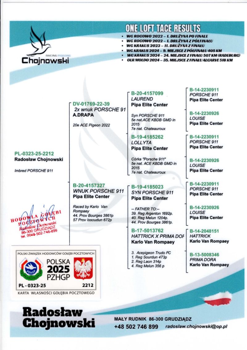 Ojciec oferowanego gołębia to wnuk PORSCHE 911 z hodowli A.Drapa , matka natomiast to wnuczka PORSCHE 911 lotowana w Belgi, zakupiona z PIPA.be . Oferowany gołąb to prawdopodobnie SAMICA. Koszt transportu 100 zł . Gołąb wychowany z boksu indywidualnego .