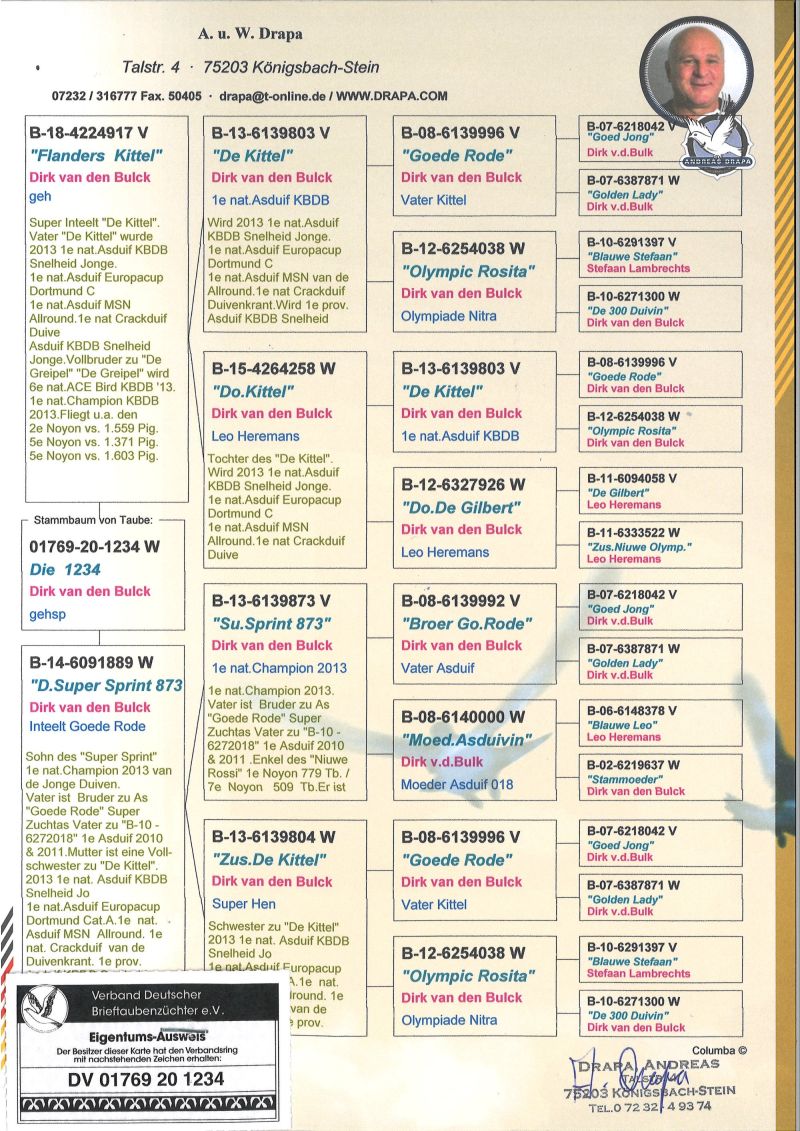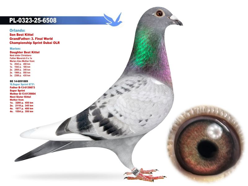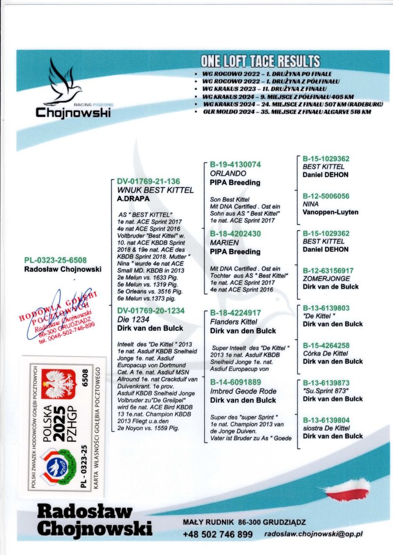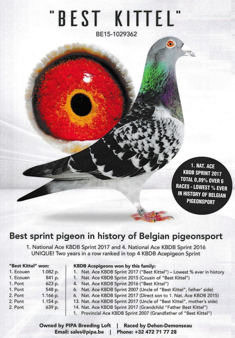 Ojciec oferowanego gołębia to podwójny wnuk BEST KITTEL z hodowli A. Drapa , matka to wnuczka De Kittel z hodowli A. Drapa. Oferowany gołąb to prawdopodobnie SAMICZKA. Koszt transportu 100 zł .
