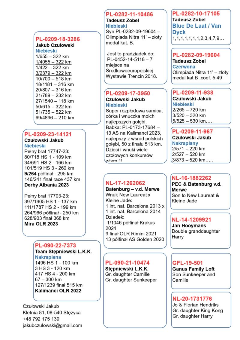 Samiec lotowany jako młody włącznie z lotem okręgowym 530 km. Ojciec to super lotnik wiele czołowych konkursów min 2x1 konk. wywodzący się z super rozpłodowca PL-0282-11-10486 od Tadeusza Zobla. Matka Stępniewski LKK, odkupiona po ciężkim sezonie na Kalimaci 2022 r gdzie była min: 1496 poz./100km, 3 poz./120km, 417 poz./200km, 67 poz./300km, 127 poz. z finału 515 km.