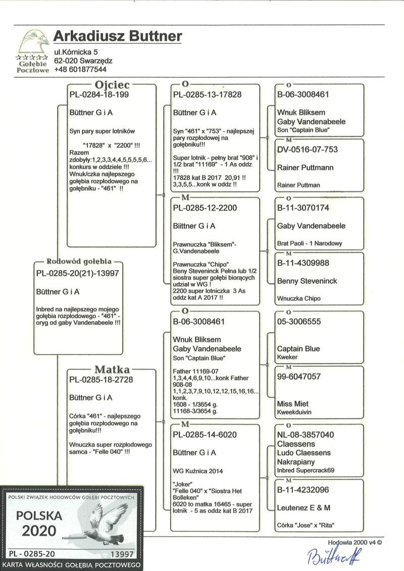 PL-0285-20(21)-13997 - oryg. Buttner G&A, inbred na najlepszego rozpłodowego gołębia - 461 od Gaby Vandenabeele