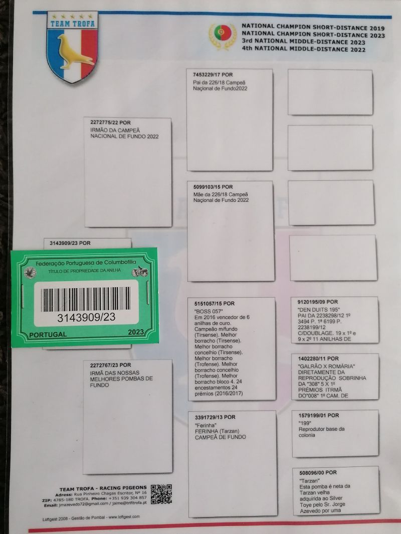 Samiec z gołębi Mistrzów Portugalii Team Trofa Linia Olympiade 003 Linia Nieuwe Olympiade gołąb z kartą i rodowodem szczegóły pochodzenia w rodowodzie i poniższych materiałach wysyłka po wpłacie na konto wysyłka 150 zł lub odbiór osobisty
