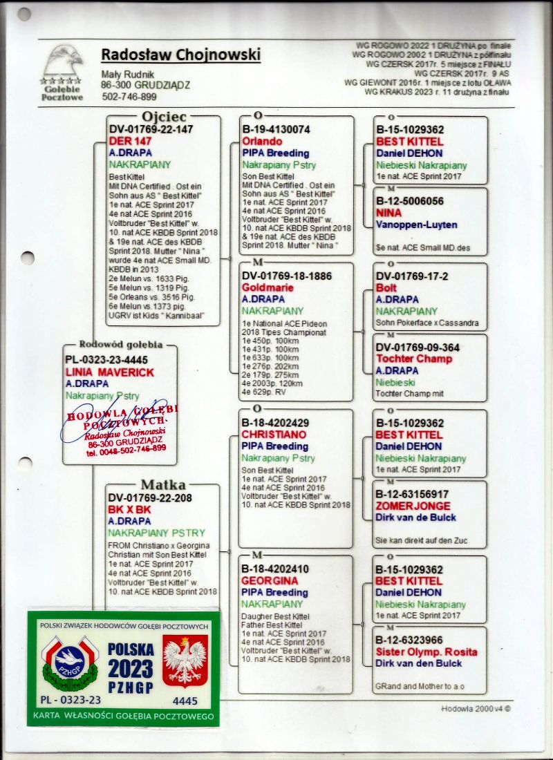 Oryginalny gołąb z hodowli Radosława Chojnowskiego. Szczegóły pochodzenia w rodowodzie. Więcej informacji pod nr tel. 507-539-168 *koszt transportu 180 zł