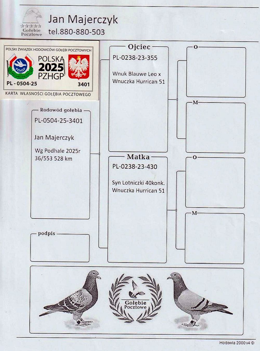 oryg. Majerczyk Jan, uczestnik WG Podhale 2025 Szczegóły pochodzenia w rodowodzie i załączonych materiałach. Więcej informacji o gołębiu pod nr tel.: 880 880 503. Gołąb z gołębnika kol. Jana Majerczyka - Oddział Zakopane.
