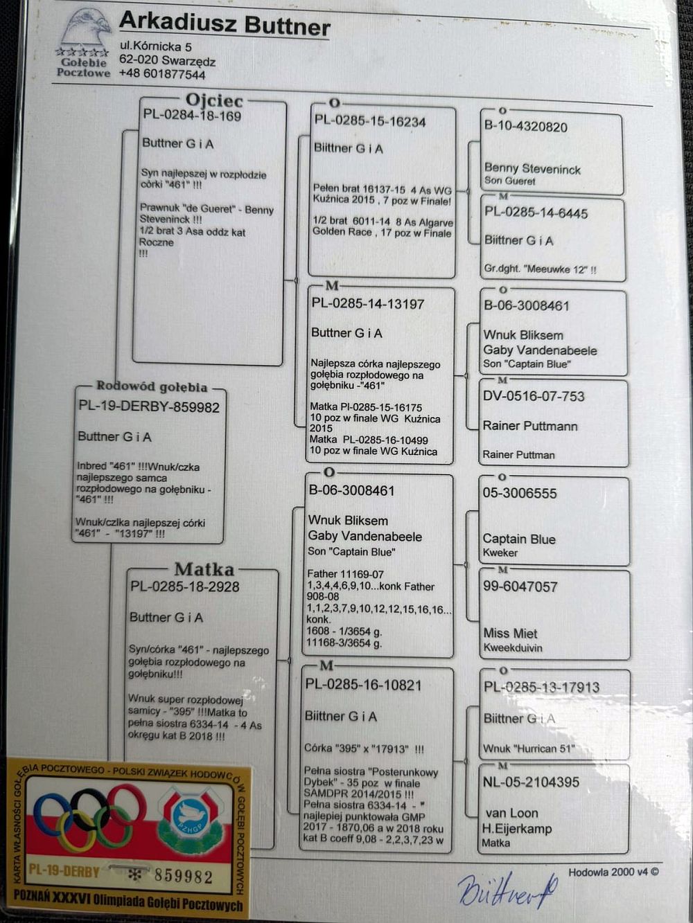 oryg. Arkadiusz Buttner Szczegóły pochodzenia w rodowodzie i załączonych materiałach. Więcej informacji o gołębiu pod nr tel.: 880 880 503. Gołąb z gołębnika kol. Jana Majerczyka - Oddział Zakopane.
