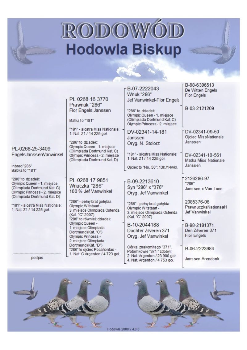 Być może samica; Inbred "286"; Babka to "181"; "286" to dziadek: Olympic Queen - 1.miejsce (Olimpiada Dortmund Kat. C), Olympic Princess - 2.miejsce (Olimpiada Dortmund Kat. D); "181" - siostra Miss Nationale: 1.Nat. Z1 / 14 225 goł.; Koszt wysyłki 150 zł ///