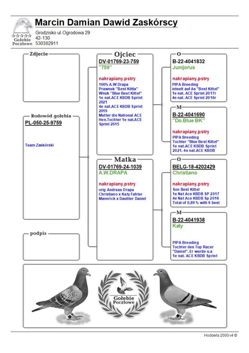 Kontakt: 530362911Opis: Nasze wyniki gołębi młodych 2025rok. I Wicemistrz- Okręgu Częstochowa Kat. GMP 25 Przodownik Regionu 5 94. Przodownik POLSKI Kat.GMP Zapewniamy transport gołębi Koszt transportu to 150zł max 6 gołębi