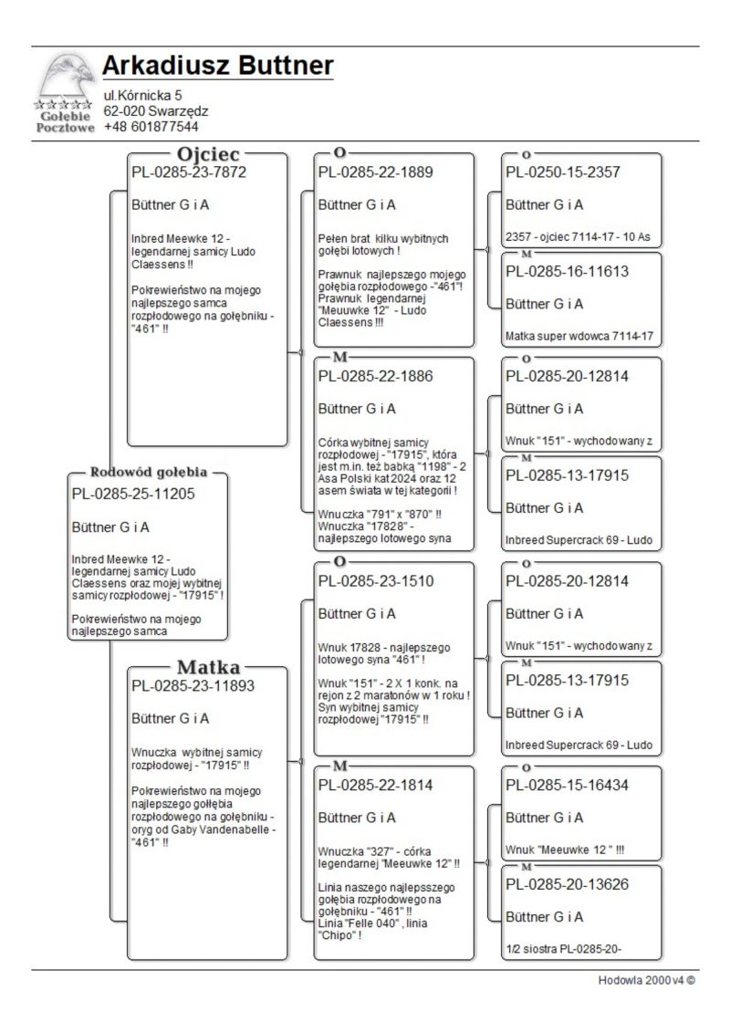 Inbred Meewke 12 - legendarnej samicy Ludo Claessens !! Pokrewieństwo na mojego najlepszego samca rozpłodowego na gołębniku - "461" - 6 x w rodowodzie ! "327" - babka 1 i 4 Asa WG Kużnica -16169-15 - 1 As WG Kuźnica - 4 poz w Finale - sprzedany za 8600 Euro na pipa.be....Babka 1 ASA odziału 0500 Chorzów Bytom Świętochłowice z 13 konkursami (7 samicą Rejonu Radzionków na ponad 17000 zgłoszonych gołębi !!) "870" - matka 14196 - 2 as oddz kat A , 8701 - ojciec 2 x 10 gołąb z finału WG Kuźnica 2015 i 2016 , i wielu wielu innych innych.Babka 1 gołębia z finału WG Podhale 2024 dla Kol. Bogdana Bieli. Babka super samca rozpłodowego u Kol Jacka Orszulika, matka "17915" - "17915" - wybitna samica rozpłodowa - babka dwóch mega lotników na PLGP u Kol Krzysztofa Mrowieca oraz babka 2 super samic Lotowych u Kol Kazimierza Goździejewskiego ( jedna w kat M w 2023 roku miała coeff 4,84 a druga w 2024 roku 2,58 - 2 x 1 na oddział - w kat "I" - coeff 9 z haczykiem) "461" najważniejsze referencje z 2024 roku: 1 As Rejonu z 8 lotów rejonowych - prawnuczka 461 u Kol Adama Gasperowicza, prawnuk "461" wygrał finał na WG Podhale wygrywając 50 000 dla Kolegi Bogdana Bieli !- liczba jedynek jego wnuków , prawnuków i oczywiście dzieci będzie około stu a kilkadziesiąt gołębi z 461 zajmowało top 10 w kat As w różnych kategoriach w różnych okręgach w Polsce- tylko w 2022 roku w 9 różnych oddziałach przeważnie prawnuki zdobywały 1 lokatę w oddz !!! Jego wnuczka została też na olimpiadzie w tym roku 4 gołębiem świata w kat H dla Kol Łukasza Reguły. !! Na screenie przykład jak potrafią siadać gołębie w oddz z linii 461 ... 3-prawnuk,4 -wnuk , 5-wnuk , 6 - roczna wnuczka - kat A 9 z groszem ma , 7 wnuk , 11 - wnuk oraz 15 - wnuk 461. oraz kolejny lot z 2020 roku : 1,2,3,5,7,8 wnuk oraz 15 prawnuk ? do tego roczna samiczka Kolegów Piotra I Marcina Żureckich z Kępna została 6 asem Polski w kat G ...tak leciała... 2 na 5200 g ze 174 km 8 na 4573 z 219 km 8 na 3583 g z 324 km 8 na 1764 g z 324 g 21 na 4535 g z 549 km - rej - coeff jak widać na zdjęciu 13,54 miała też szósty super lot była 25 na 4984 g coeff 5,02 1 goląb z Extra finału na WG Giewont 2022 dla Teamu Chudy-Molek to też linia "461" ojciec to syn mojej super wdowy 2161-12 ,, Dwie Prawnuczki .... u Kol Kazimierza Goździejewskiego ( jedna w kat M w 2023 roku miała coeff 4,84 ( 1 as okręgu Wałbrzych a druga w 2024 roku 2,58 - 2 x 1 na oddział (2 as Polski kat M w/g miesięcznika "Hodowca") - w kat "I" - coeff 9 z haczykiem), "461" to też pradziadek PL-0122-22-2219 - w 2 sezony na 21 wkładań 20 konkursów - kat A coeff 9,08 a z dwóch lat do wystaw kat A-74,86 , kat B-65,94 a kat D-72,20 W 2023 roku zdobył 1 konk na ok 4100 gołębi z miejsc Sulechów a w 2024 roku 2 x 2 konk w oddz !!! oraz pradziadek PL-0122-22-5510 w kat A w 2024 roku uzyskał coeff. 4,75 Zdobył też 1 konk na oddz z miejsc. Brzeg Dolny na 4322 gołębie !! Został też 4 Asem Polski kat krótki dystans 2024 z coeff 17 z groszem z 5 lotów do kat A właśnie dla Kolegi Jacka Orszulika !!! oraz wiele,wiele innych.....od 2017 roku 30x mistrzostwo oddz w różnych kategoriach w tym 2019-2021 3 x z rzędu supermistrzostwo oddziału Poznań, więcej info 601 877 544