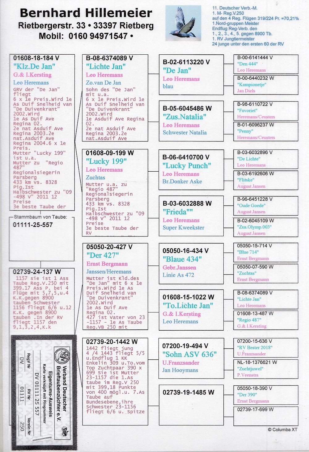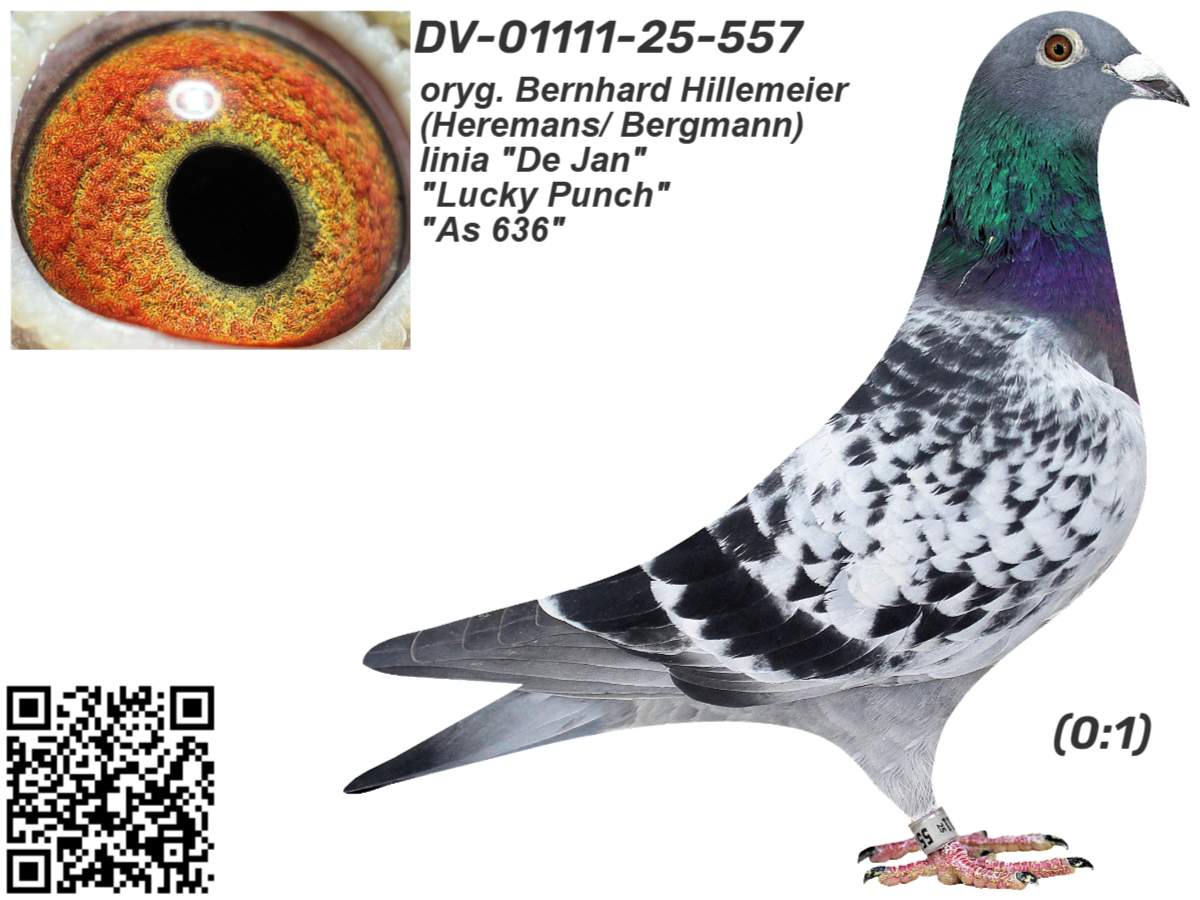 oryg. Bernhard Hillemeier (Heremans/ Bergmann), linia "De Jan", "Lucky Punch", "As 636" Szczegóły pochodzenia w rodowodzie. Gołąb jest sprzedawany bezpośrednio od hodowcy i znajduje się w Polsce, można go obejrzeć w miejscowości Zblewo (woj. pomorskie), po wcześniejszym kontakcie telefonicznym. Więcej informacji o gołębiu i transporcie pod nr tel.: 511 607 710.