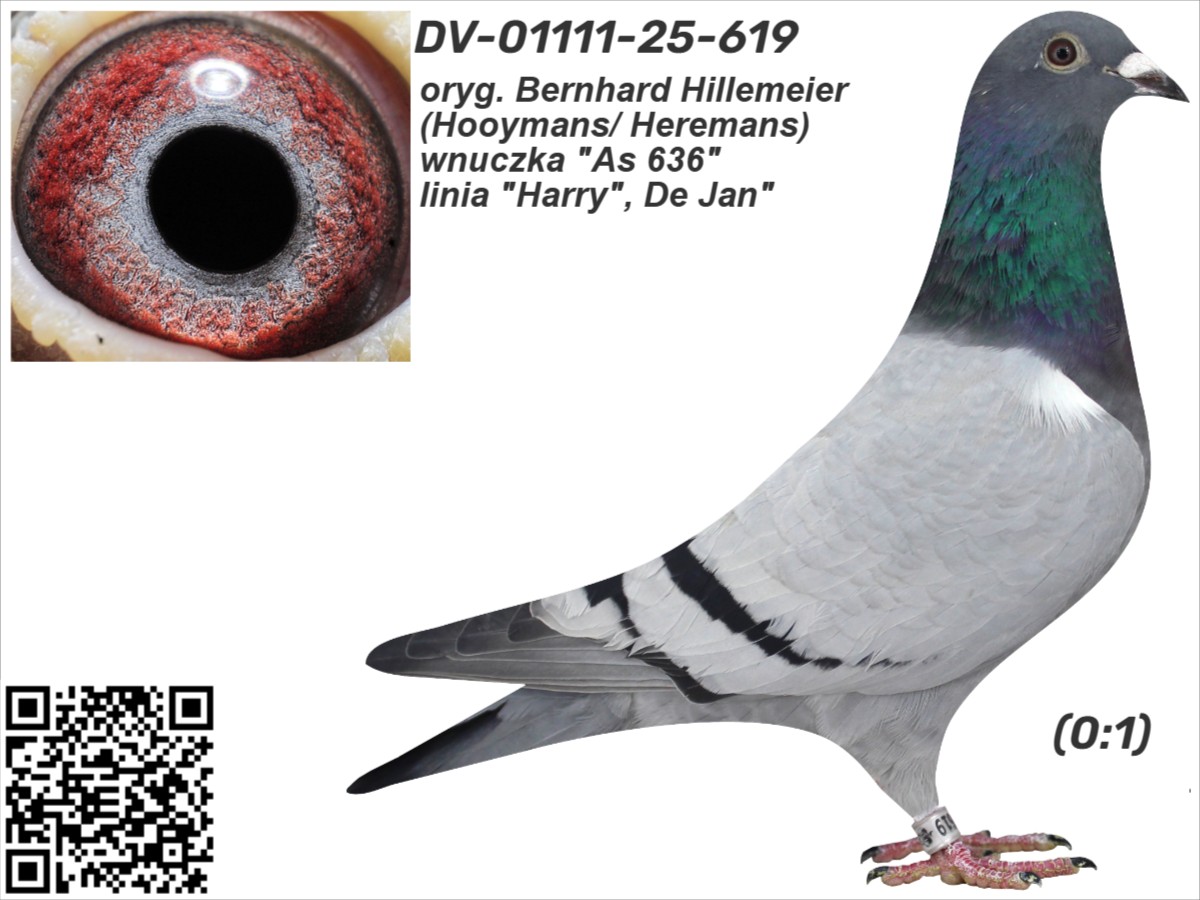 oryg. Bernhard Hillemeier (Hooymans/ Heremans), wnuczka "As 636", linia "Harry", De Jan" Szczegóły pochodzenia w rodowodzie. Gołąb jest sprzedawany bezpośrednio od hodowcy i znajduje się w Polsce, można go obejrzeć w miejscowości Zblewo (woj. pomorskie), po wcześniejszym kontakcie telefonicznym. Więcej informacji o gołębiu i transporcie pod nr tel.: 511 607 710.
